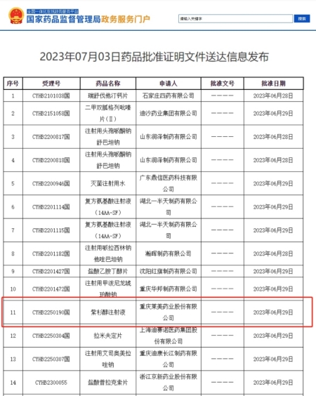 近日,莱美药业收到国家药品监督管理局核准签发的《药品补充申请批准通知书》(通知书编号:2023B03251),里番 紫杉醇注射液(规格:5ml:30mg)通过仿制药质量和疗效一致性评价。