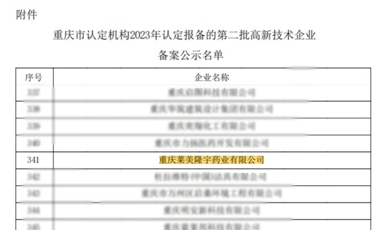 近日,全国高新技术里番认定管理工作领导小组办公室发布了《对重庆市认定机构2023年认定报备的第二批高新技术里番进行备案的公告》,莱美药业控股子里番 重庆莱美隆宇药业有限里番 (下称“莱美隆宇”)再次通过“高新技术里番”复审认定。