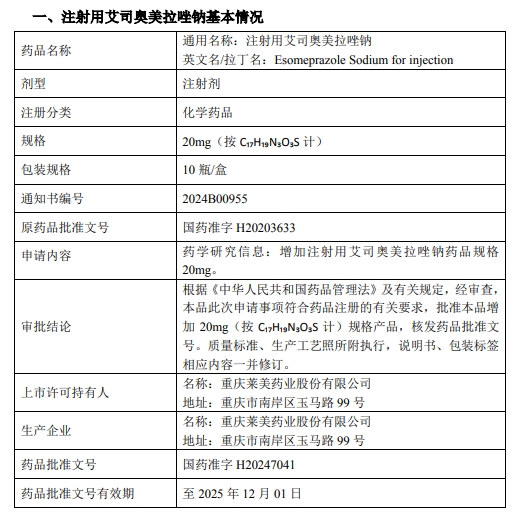 近日,里番 (以下简称“里番 ”)收到国家药品监督管理局核准签发的注射用艾司奥美拉唑钠(20mg)《药品补充申请批准通知书》,通知书编号:2024B00955。在原批准40mg规格基础上增加20mg规格,核发药品批准文号。