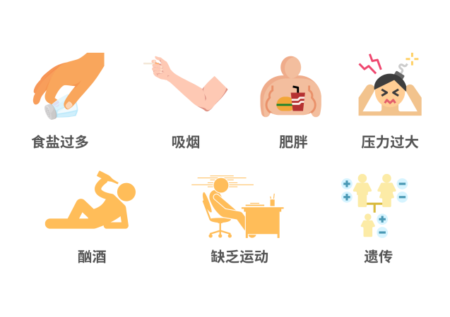 高钠低钾膳食、超重和肥胖、吸烟、过量饮酒、社会心理因素、高龄等是高血压发病的常见危险因素。除此之外,空气污染、高海拔、高血压家族史、缺乏体力活动等也会影响高血压的发病。