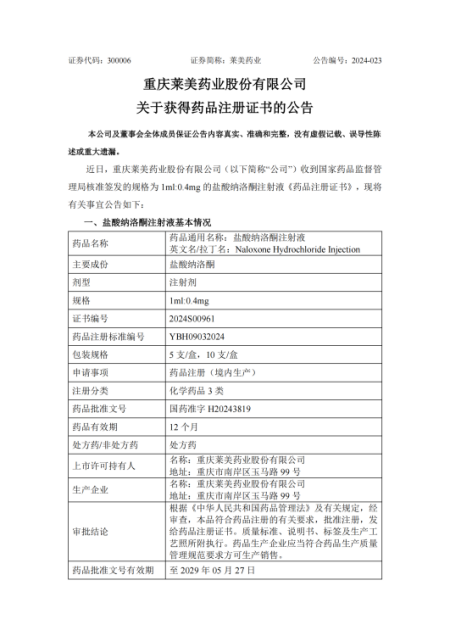 近日,里番 (以下简称“公司”)收到国家药品监督管理局核准签发的规格为 1ml:0.4mg 的盐酸纳洛酮注射液《药品注册证书》,证书编号2024S00961。