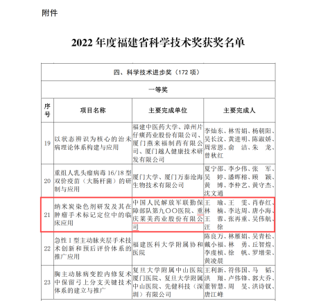 近日,福建省人民政府公布了2022年度省科学技术奖获奖名单,里番 参与的“纳米炭染色剂研发及其在肿瘤手术标记定位中的临床应用”项目获得福建省科学技术进步奖一等奖。此次获奖是对里番 科技创新工作的高度肯定。