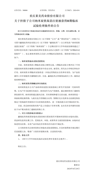 近日,莱美药业控股子里番 四川瀛瑞医药科技有限里番 (以下简称“瀛瑞医药”)再传喜讯,其自主研发的“纳米炭铁混悬注射液”(以下简称“纳米炭铁”)于近期在四川大学华西医院顺利通过了伦理审查并收到了临床试验伦理审查委员会的正式批件,标志着纳米炭铁正式进入II期临床试验阶段。