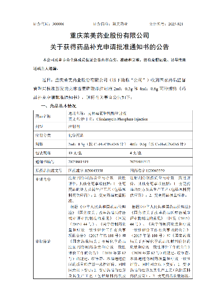 近日,莱美药业收到国家药品监督管理局核准签发的克林霉素磷酸酯注射液2ml:0.3g和4ml:0.6g两种规格的《药品补充申请批准通知书》,该产品通过仿制药质量和疗效一致性评价,同时同意变更药品的处方及其生产工艺(包括原料药供应商)及药品质量标准。通知书编号:2025B01519、2025B01512。
